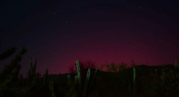 En medio de un paraje semidesértico, la aurora boreal, maravilla de la naturaleza cósmica, se hizo omnipresente coloreando el cielo de morado de Santa Catarina y David con su cámara en modo manual capturó el momento.
