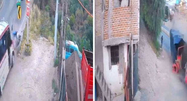 En el video se observa el momento en que el tráiler choca con el costado izquierdo del camión de transporte público y al mismo tiempo impacta a dos motociclistas que circulaban por la zona y los proyecta hacia el acotamiento.