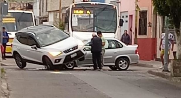 El accidente se registró esta mañana y la camioneta de la marca Seat quedó suspendida como si estuviera en el aire, por lo que esta mañana la zona centro parecía el set de una película de acción ya que los dos vehículos cruzaron con prisa.
