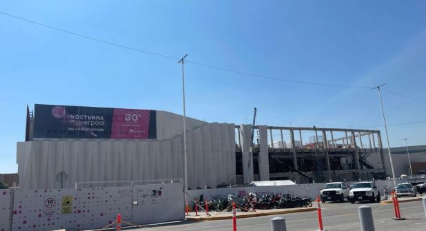 Desde el estacionamiento se observa la construcción del nuevo espacio para Liverpool, con una fachada minimalista en color blanco, que aún no está terminada. Una gran lona que se ve desde el bulevar, cuelga del edificio anunciado que la tienda ofertará sus productos el 30% de descuento.