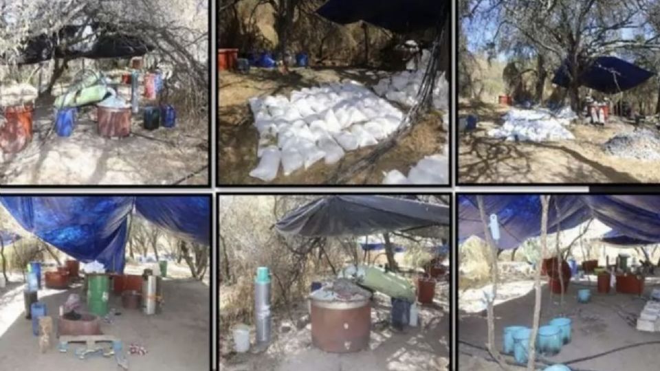 El laboratorio estaba ubicado en una zona de difícil acceso, cerca de una área cerril, lo que complicaba su localización. Sin embargo, gracias a trabajos de inteligencia y recorridos de vigilancia, las autoridades lograron identificar y desmantelar el sitio. Fotografías del lugar muestran que las instalaciones estaban cubiertas por una lona de plástico azul, y en el suelo se encontraban dispersos diversos recipientes y contenedores utilizados en la fabricación de la droga.