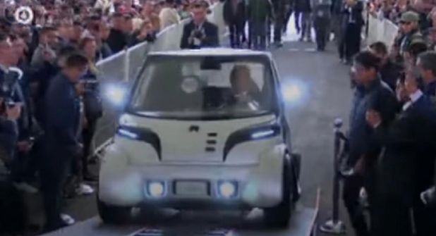 El gobernador llegó a su último informe manejando un coche pequeño color blanco, hecho por alumnos de la División de Ingenierías del Campus Irapuato-Salamanca (DICIS) de la Universidad de Guanajuato (UG).