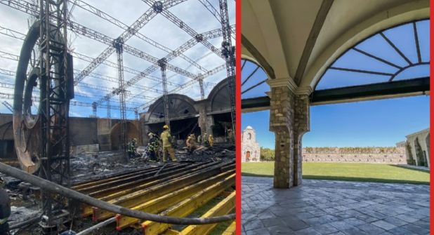 San Miguel de Allende.- Las imágenes de la destrucción se ven reflejadas en las fotos que tomaron los Bomberos de San Miguel de Allende luego de sofocar el incendio del pasado sábado en el salón Hacienda Los Arcángeles. Algunas columnas de acero todavía en pie, pero desnudas del decorado que soportaban y que daba forma a un enorme domo en el jardín principal de la hacienda, decorado que fue presuntamente la clave del fuego que devastó el lugar y puso en riesgo a cientos de personas.