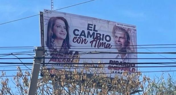 Pero el espectacular dice: Alma Alcaraz gobernadora y Ricardo Sheffield Senador… “El cambio con Alma”.