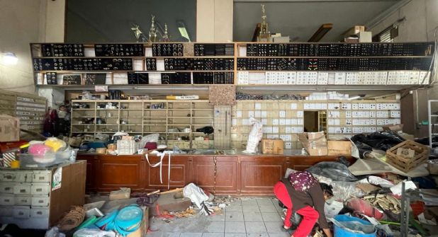 En días anteriores se ha sacado mobiliario de lo fue la Peletería La Nacional, pero todavía podían observarse las muestras de cierres y hebillas en los mostradores, como se comerciaban antes de que cerrara el negocio.
