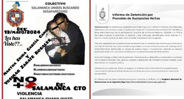 El Gobierno de Salamanca lanzó un comunicado mediante Facebook en el que desmintió la presunta desaparición forzada de la pareja. Afirmó que ambos habían sido detenidos y están a disposición del Ministerio Público federal por posesión de drogas.