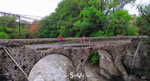 Los habitantes de Salvatierra, Guanajuato, han cruzado el Río Lerma por el Puente de Batanes desde hace siglos, y en este siglo XXI, una parte de esta construcción histórica, el pretil, se desploma tras las fuertes lluvias.