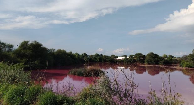 León.- Agua pintada de rosa se quedó estancada en un bordo que se ubica en la comunidad de la Puerta de San Germán, entre los límites de León y San Francisco del Rincón, por el lado de la comunidad El Maguey.