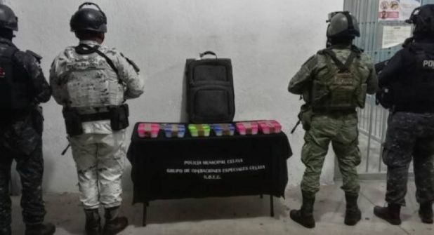 Celaya.- Los elementos del Grupo de Operaciones Especiales de Celaya (GOEC) de la Policía Municipal, Ejército y la Guardia Nacional hallaron una maleta con 6,000 dosis de cristal en la Central de Autobuses de Celaya.