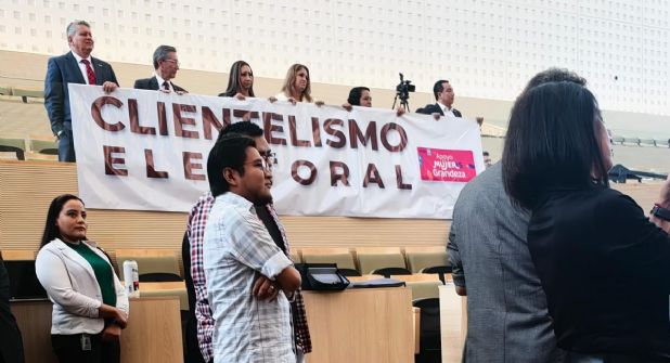 Detrás de ella, diputados de Morena como David Martínez y otros compañeros de partido sostenían una lona con sus protestas.