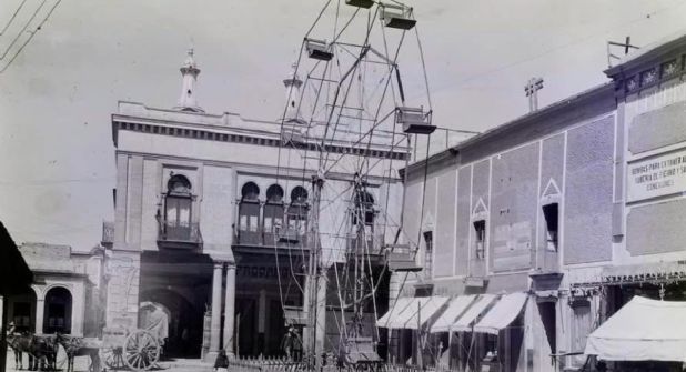 En la fotografía se puede observar una antigua rueda de la fortuna que apenas y podía superar la altura de un edificio de la plaza principal en la zona peatonal. Un juego mecánico del que quizá se podían divisar algunas cuadras de la ciudad, pero que seguramente fue una las primeras atracciones mecánicas de la hoy Feria Estatal de León.
