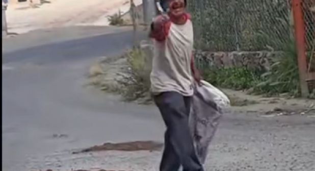 Mediante redes sociales se difundió un video en el que se ve que Don Meche deja primero seguro a su burrito en una banqueta, para luego con unas bolsas de tierra tapar los agujeros.