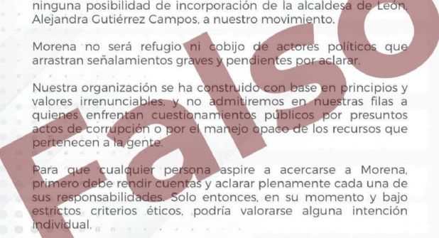 Guanajuato-. Se estuvo compartiendo este lunes, antes del medio día, un comunicado (falso) en el que, supuestamente, Morena Guanajuato no aceptaba que Alejandra Gutiérrez formara parte del Movimiento de Regeneración Nacional. El partido fundado por López Obrador emitió una respuesta oficial: "El comunicado que circula es FALSO. No proviene de Morena Nacional ni de Morena Guanajuato".