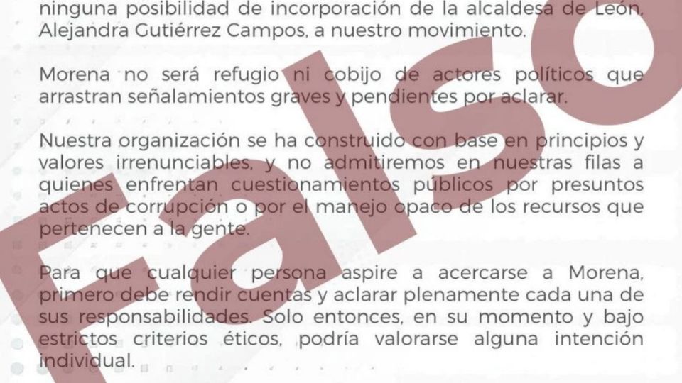 “Morena no será refugio ni cobijo de actores políticos que arrastran señalamientos graves y pendientes por aclarar" señala el comunicado que se difundió ante la hipotética salida de Alejandra Gutiérrez Campos, presidenta municipal de León