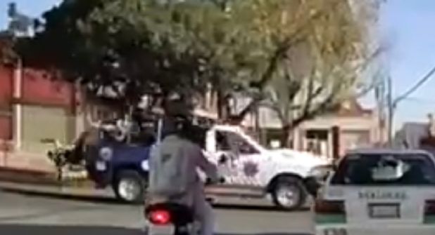 La patrulla circulaba por el bulevar Mariano Abasolo en la intersección con la calle Hidalgo, era una mañana cotidiana para un grupo de policías de Celaya, cuando de pronto uno de los elementos cayó al suelo, y la situación asustó a los otros conductores que vieron el accidente de cerca.