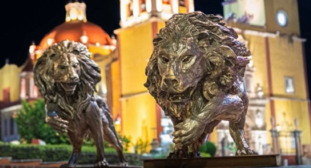 Los leones tienen de fondo la Basílica de Nuestra Señora de Guanajuato y están allí para expresar la obra del pintor y escultor Javier Hernández. Por parte de la Fundación Artística Velasco.