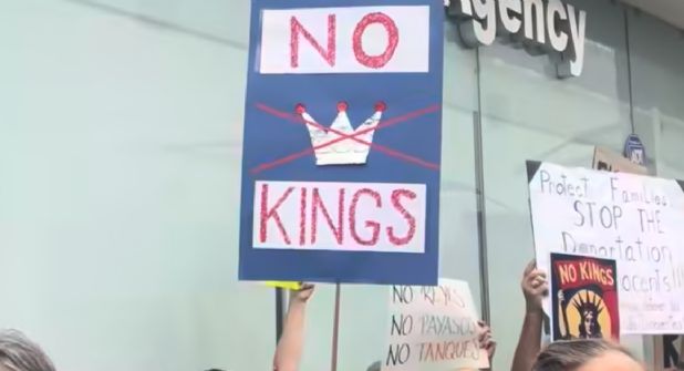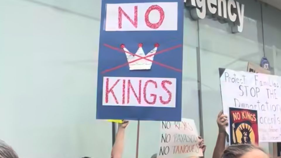 León-. "No dictator, no King Impeach & Imprison" se lee en la pancarta de una mujer estadounidense que vive en San Miguel de Allende, y como ella otros "American Citizen" también se unieron a las protestas del "No kings": la primera gran protesta nacional contra la política migratoria (agresiva) de Donald John Trump.