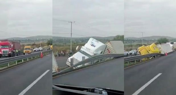 Guanajuato.- Un fuerte accidente se registró esta mañana en la carretera Abasolo-Irapuato, cerca del entronque a Cuerámaro, por lo que el tráfico se encuentra detenido. Se trata de cuatro tractocamiones que se impactaron.