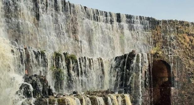 Comonfort-. Aparece solo cuando llueve. El lugar se transforma por completo cuando cae la lluvia sobre los cerros y el agua llena la represa y entonces: cae un velo de agua sobre la antigua cortina de piedra de la presa de Las Minas en el municipio de Comonfort en la comunidad de Las Gallinas.