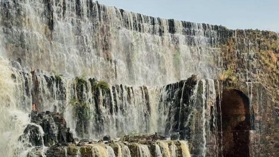 El velo de agua se forma en los muros de roca de la presa de Las Minas, la belleza del lugar aparece cuando el agua sobrepasa la capacidad de almacenamiento.