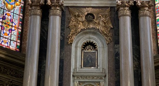 En lo alto del atrio de la Catedral Basílica Metropolitana de León se encuentra el cuadro de Nuestra Señora de la Luz, patrona de los leoneses.