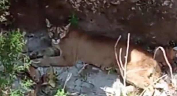 León-. Le tomaron la fotografía a un puma (Puma concolor). Estaba debajo de una roca en la que tomó descanso en la sombra. Se le vio moverse ágilmente en el campo. Se observó en la comunidad Doña Juana en la carretera de camino a Jalpa.