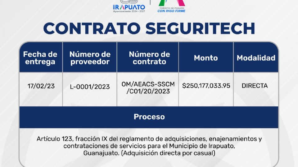 Señaló que el contrato del anterior trienio fue por 250 millones 177 mil 033 pesos, los cuales se pagaron el 17 de febrero del 2023, en el segundo año de la administración 2021-2023, contrato que fue por asignación directa, es decir, sin licitación.