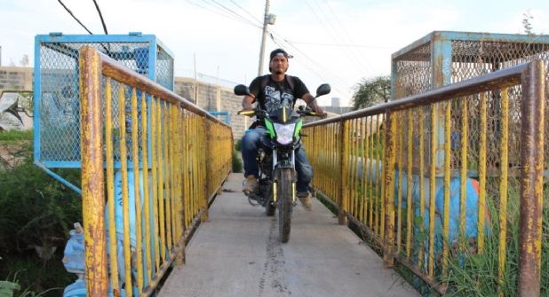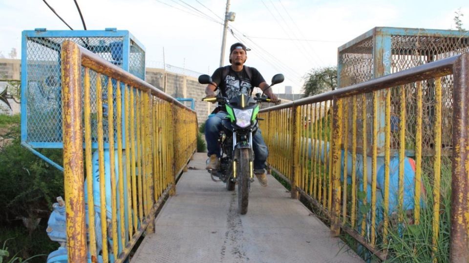 Los vecinos de Ribera de Medina todos los días cruzan por ese único puente de barrotes y lámina. Solo hay espacio para que pase una motocicleta o una bicicleta.