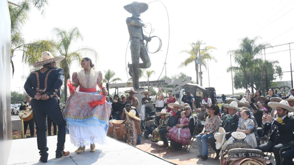 Irapuato.- Sobre el bulevar Solidaridad, esquina con avenida Siglo XXI, en Irapuato, fue develada una nueva escultura: “La Charrería”.