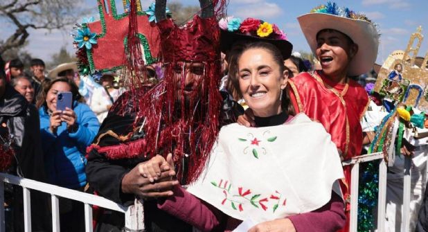 Claudia Sheinbaum llegó alrededor de las 11:00 de la mañana de este domingo 18 de enero a la comunidad Cruz del Palmar, de San Miguel de Allende, Guanajuato, en donde fue recibida por integrantes de la hermandad Hñähñu-Chichimecas quienes le entregaron diversos obsequios que posteriormente lució durante el evento.