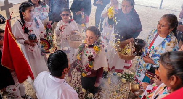 En la ceremonia de bendición le entregaron a la presidenta Claudia Sheinbaum un collar de flores y Maximino Ortiz Estrada, consejero de la mencionada hermandad fue el encargado de hacerle la bendición a los cuatro vientos con la intención de que "todos los ancestros la protejan".