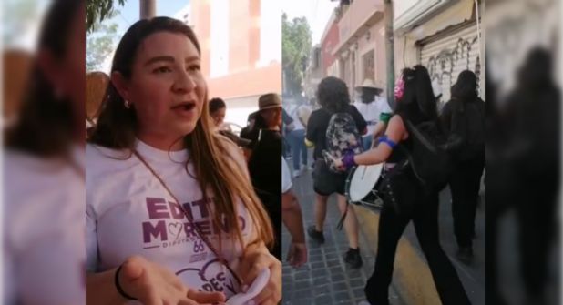 Fue entonces cuando llegaron las mujeres del “bloque negro”, que traían consigo algunos tambores y empezaron a tocar alrededor de ella. Esto obligó a la diputada a caminar y salir del contingente hacia la Calzada Independencia, mientras el contingente caminaba sobre la calle de Madero.