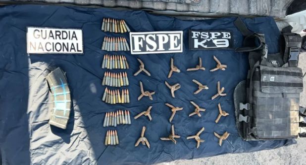 Entre lo asegurado se encuentran 65 cartuchos calibre 7.62, un cargador para arma larga, un chaleco balístico con placas, 16 ponchallantas y 11 bolsas con aproximadamente 640 gramos de hierba con características de la marihuana. También fue asegurada la camioneta en la que se transportaba el material.