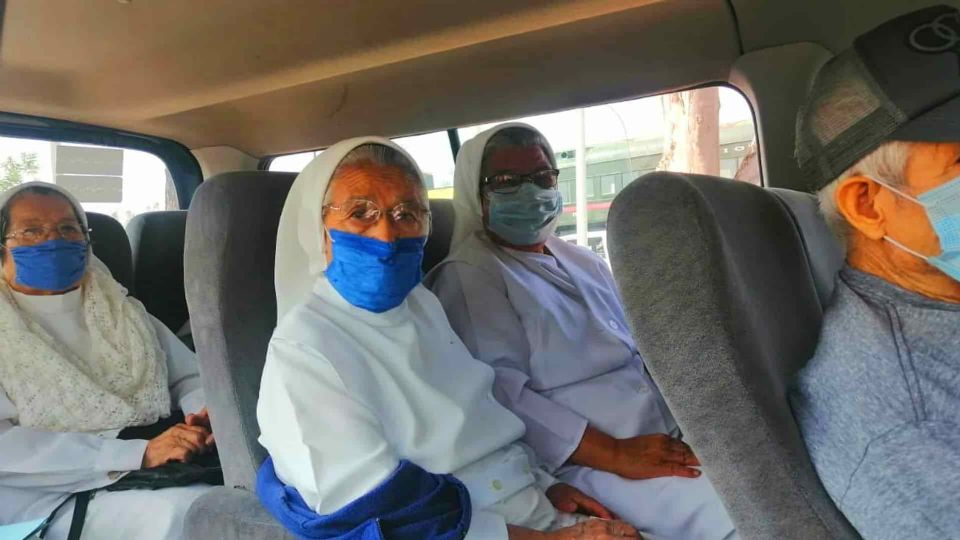 Las monjas se desplazaron desde la congregación San Francisco de la Inmaculada Concepción, ubicado en El Coecillo, a 3.7 kilómetros de la Velaria, en auto. Hacen fila en la sede de vacunación con esta modalidad, que es apta solo para personas que van en vehículos, y que solo estará habilitada este lunes.