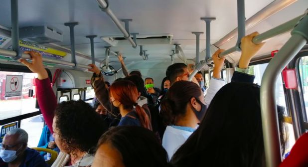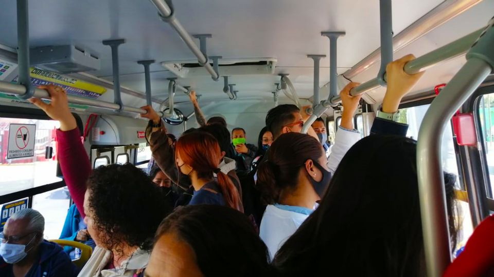 La gente se agarra de donde puede, hacen espacio entre unos y otros y tratan de no pegarse. Todos traen cubrebocas pero están expuestos a contagiarse de covid-19. Así se vive en el transporte público, como “sardinas” dicen las personas coloquialmente.