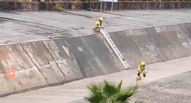 León.- Un par de bomberos arribaron a el malecón del Río de los Gómez para rescatar a un perrito que al parecer se encontraba atrapado dentro en la corriente, pero cuando intentaron sacarlo, el can salió por su cuenta.