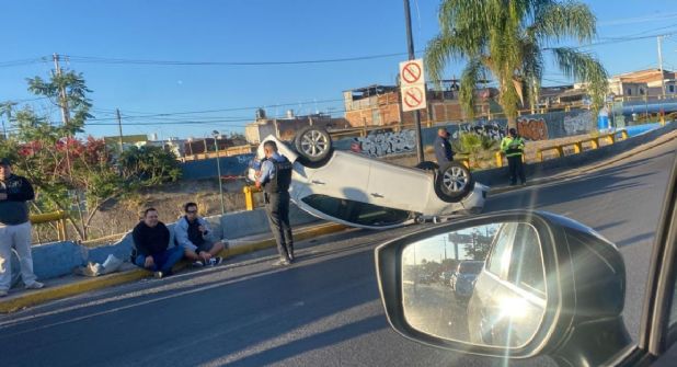 León.- Un automóvil se volcó en la avenida Insurgentes a la altura del Malecón del Río, los tripulantes del vehículo al parecer no sufrieron lesiones de consideración, fueron auxiliados por elementos de la Policía Municipal y de Vialidad de León.