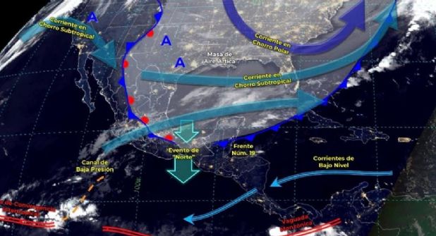 La masa de aire ártica que impulsa al frente mantendrá la onda gélida sobre gran parte del territorio nacional, así como evento de “Norte” intenso con oleaje elevado en el litoral del Golfo de México, la Península de Yucatán, Istmo y Golfo de Tehuantepec. Se pronostica la probabilidad para la caída de aguanieve o nieve en zonas serranas de San Luis Potosí, Querétaro, Hidalgo, Veracruz, Puebla, Tlaxcala, Estado de México y Ciudad de México.