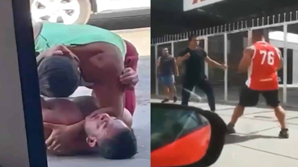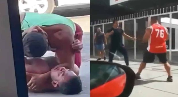 Otro video más muestra la pelea entre otros dos hombres más con el aspecto de fisicoculturistas, como si se tratara de dos grupos rivales que se dividieron en turnos para confrontarse.