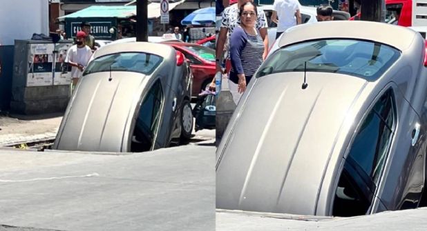 León.- Un conductor quedó atascado dentro de su auto esta tarde después de caer en una alcantarilla de la Comisión Federal de Electricidad. El lugar donde ocurrió fue el mismo donde hace una semana un transformador de la CFE hizo cortocircuito.
