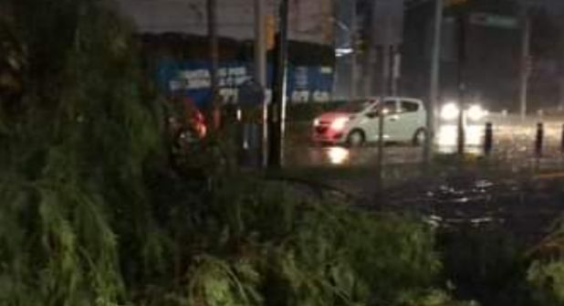 León.- Una fuerte tormenta, acompañada con fuertes rachas de viento y un poco de granizo se registró alrededor de las 9 de la noche en León, provocando caídas de árboles y mobiliario urbano, así como encharcamientos en la mayoría de las vialidades de León.