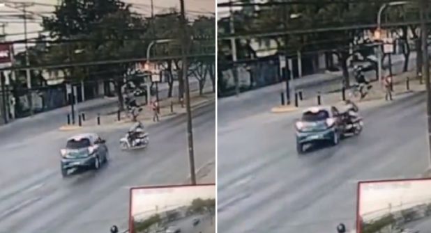 En el mencionado crucero se observa que la luz del semáforo se encuentra en verde y pasan varios vehículos, en unos segundos la luz cambia a rojo y se ve que de la calle San Jacobo empiezan a cruzar motociclistas, pero en ese momento el conductor de un automóvil marca Nissan, línea March, no respeta la luz roja e impacta a uno de ellos y lo lanza varios metros.