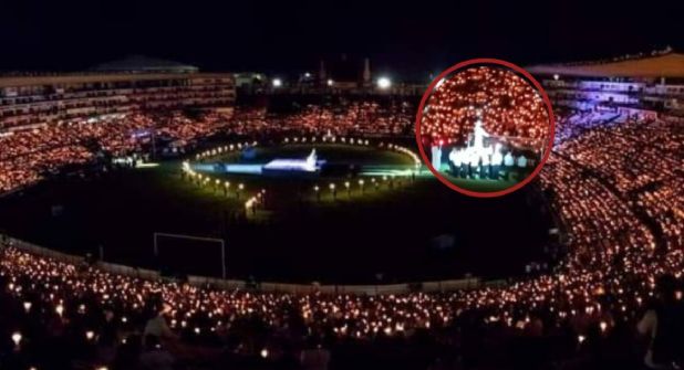 De vuelta en León, el estadio se llenó creyentes portando ropa blanca y cargados de banderitas con imágenes religiosas que por la noche fueron opacados por la oscuridad hasta que acabaron con ella encendiendo miles de velas que iluminaron el reciento mientras elevaban sus oraciones al cielo.
