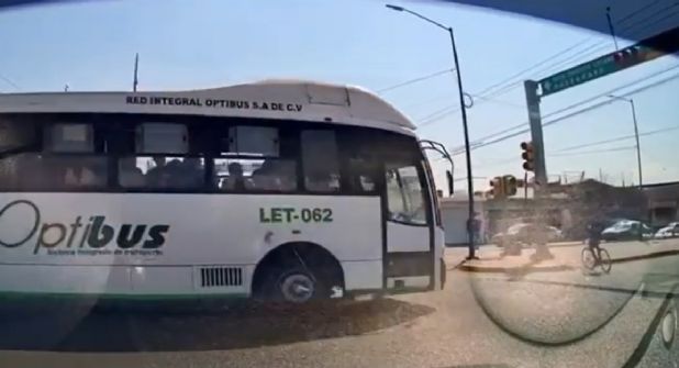 León.- Tripulantes de un automóvil grabaron el momento exacto en que un autobús articulado del transporte público de León, mejor conocido como “oruga” casi atropella a un ciclista.