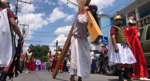 Isarael o “Ray”, como le dicen en el barrio, quien da vida a Jesús de Nazaret, se dispuso a cargar una gran cruz de madera, así partió rumbo a las calles de San Miguel; los legionarios romanos le propinaban azotes a su espalda, mientras que los espectadores veían con horror e imaginaban el castigo de Cristo hace más de 2,000 años: “¡Ay, le pegan bien feo!”, exclamó una adolescente.