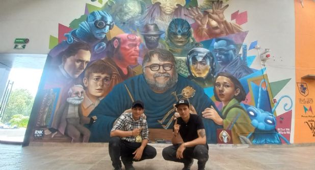 Los artistas urbanos compartieron con la Silla Rota la admiración que sienten por el trabajo del director de Pinocho, inspirados y con sus latas de aerosol, pintaron en el mural a los protagonistas de las películas del director tapatío, como Ofelia, el Fauno y el Hombre pálido del Laberinto del Fauno; el Demonio rojo de Hellboy, el Hombre anfibio de la Forma del agua.