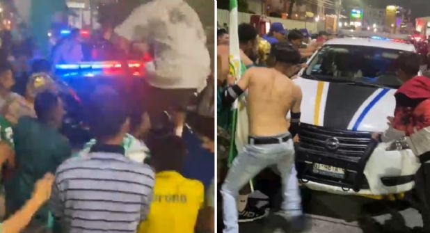 Inmediatamente procedieron a sacudir otro de los vehículos oficiales con todo y los policías dentro, una vez hecho eso los aficionados esmeraldas corrieron a seguir con su festejo.