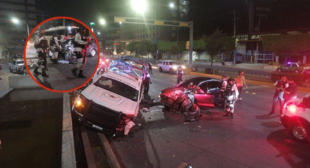 León.- Una patrulla de la Guardia Nacional chocó a toda velocidad cerca de la medianoche del martes contra un automóvil particular frente al Estadio León, con saldo de un oficial y una mujer civil lesionados. Los daños materiales fueron cuantiosos, pues el auto quedó prácticamente inservible y la unidad oficial sufrió severas averías.