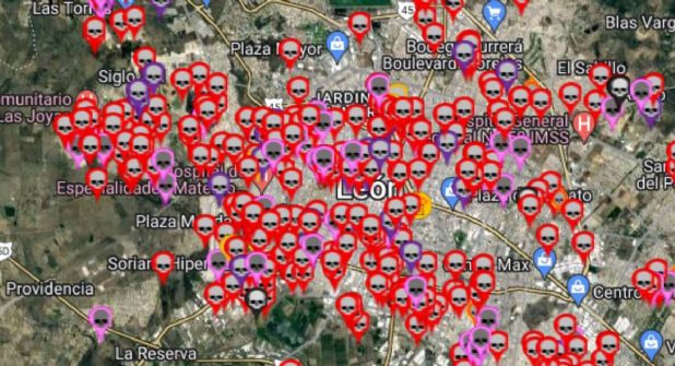 León.- En un detallado trabajo de investigación y análisis, el perito criminalista Armando Zamora ha desarrollado un mapa interactivo sobre los hechos criminales en León. En el plano aparecen calaveras enmarcadas en rojo cuando se trata del homicidio de un hombre; en rosa, si fue una mujer, y en morado si fue asesinato múltiple. Cuando es un hallazgo de restos humanos, la figura de la calavera viene enmarcada en amarillo.