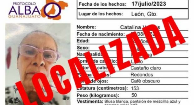 Luego de una semana que había sido reportada desaparecida, la Fiscalía General del Estado de Guanajuato (FGEG) dio a conocer que Catalina Vargas fue localizada con vida en un anexo de la ciudad de León y se reintegrará a su núcleo familiar.